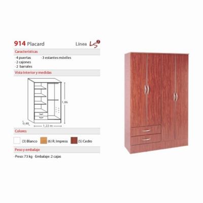 Placard 4 puertas, 2 cajones, 2 barrales y 3 estantes móviles. Fabricado en melamina, color blanco.
